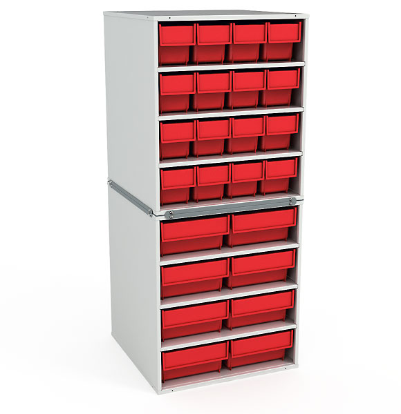 Стационарная кассетница собирается из Кассеты К-01/1 и Кассеты К-01/2. Кассета К-01/1 — в комплекте 8 ящиков серии Б 400х185х100 на 7 литров каждый, Кассета К-01/2 — в комплекте 16 ящиков серии Б 400х92х100 на 3,5 литров каждый.