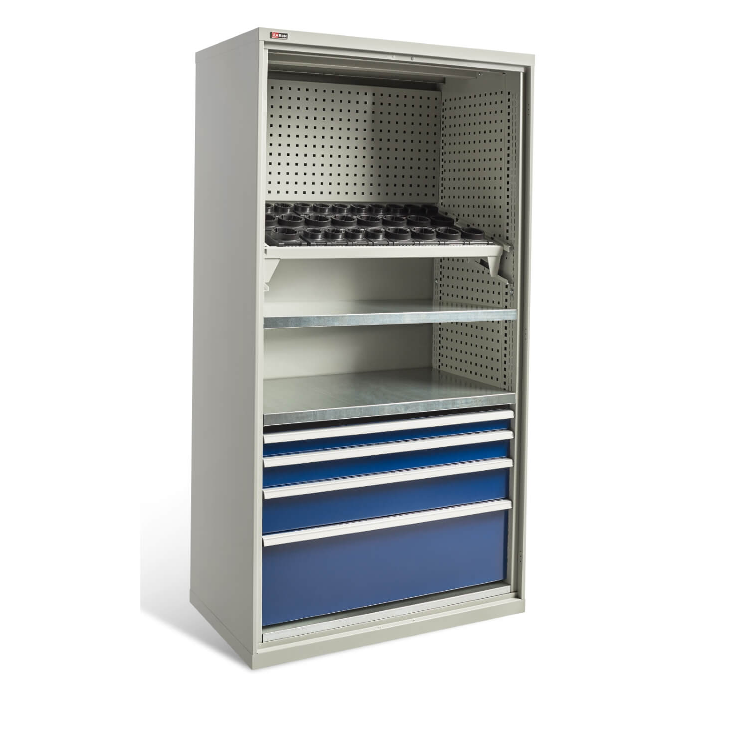 Шкафы и модули окрашены эпоксидной порошковой краской, устойчивой к механическим воздействиям и агрессивным жидкостям. Корпус и экран – серые RAL 7038; ящики и двери – темно-синие RAL 250 20 20; Подставка – черный RAL 9005.