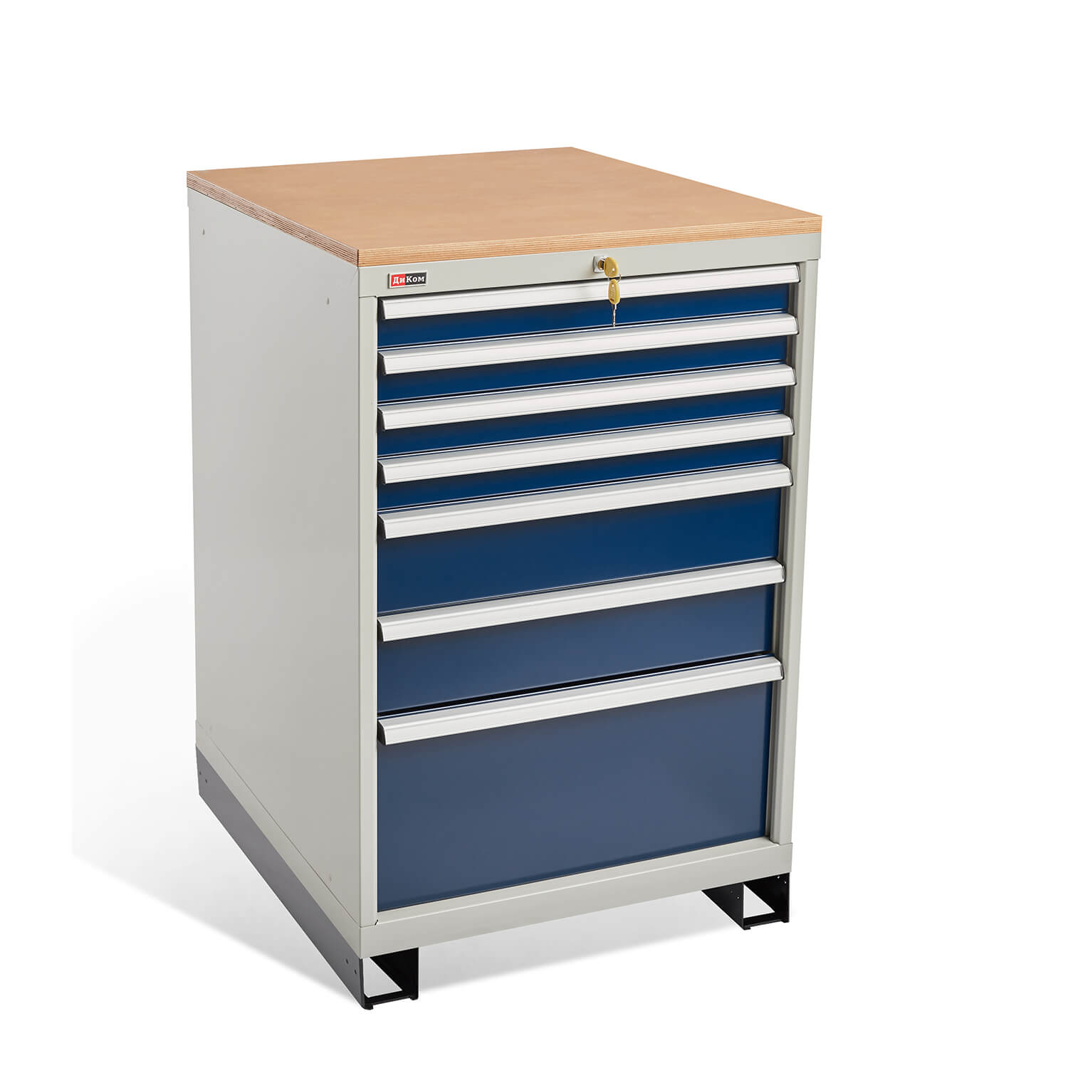 Семь выдвижных ящика тумбы высотой 75 мм, 150 мм, 300 мм оснащены общим центральным замком EURO-LOCKS (Германия, 2000 комбинаций). Внутренняя высота ящика меньше на 20 мм.