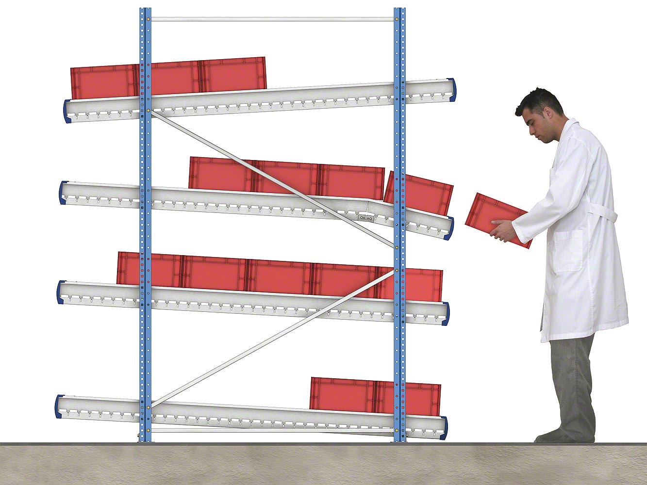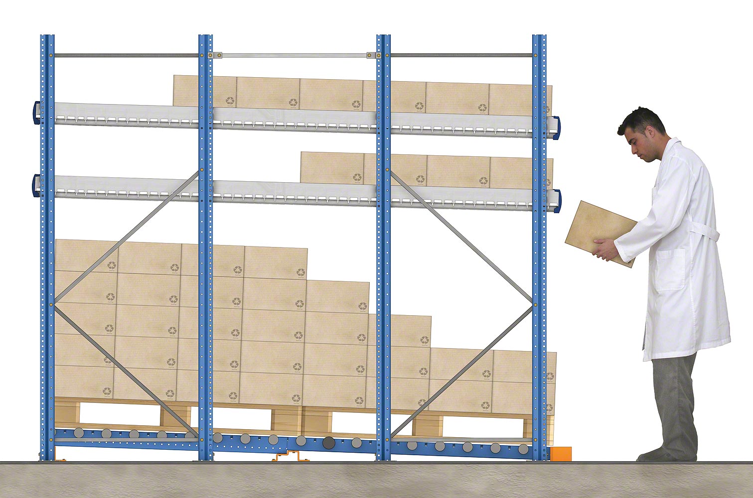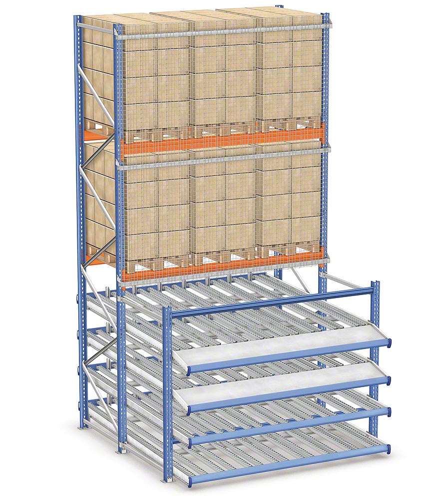 Стеллажи состоят из наклонных платформ с рольгангами или роликовыми дорожками, которые гарантируют оптимальную загрузку и выгрузку материала. Товар поступает с одного конца и под действием силы тяжести двигается к противоположной стороне канала, откуда производится его выгрузка. Таким образом обеспечивается отличная ротация продукта, избегается взаимоналожение задач по восстановлению складских запасов и извлечению материала, и в то же время повышается скорость обработки заказов.