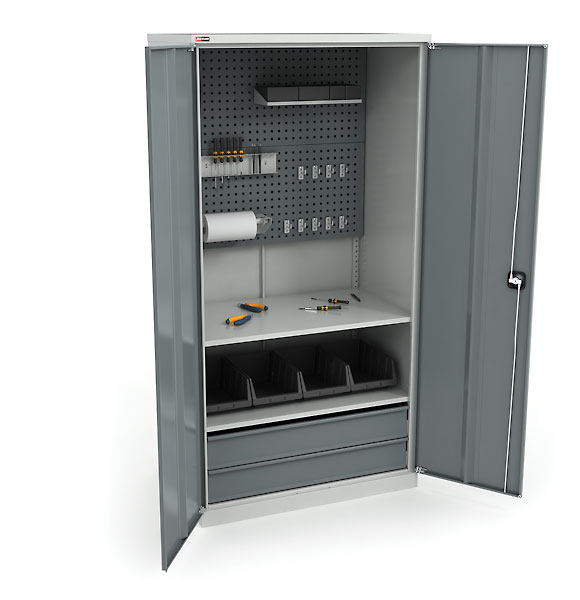 Каждый элемент окрашен специальной порошковой краской, которая обеспечивает антистатическую защиту. Корпус шкафа, и ВЛ-05 Полка ESD - цвет светло-серый RAL 7035; Двери шкафа, ВЛ-05 Экран ESD и ВЛ-05 Ящик ESD – цвет графитовый RAL 7012.