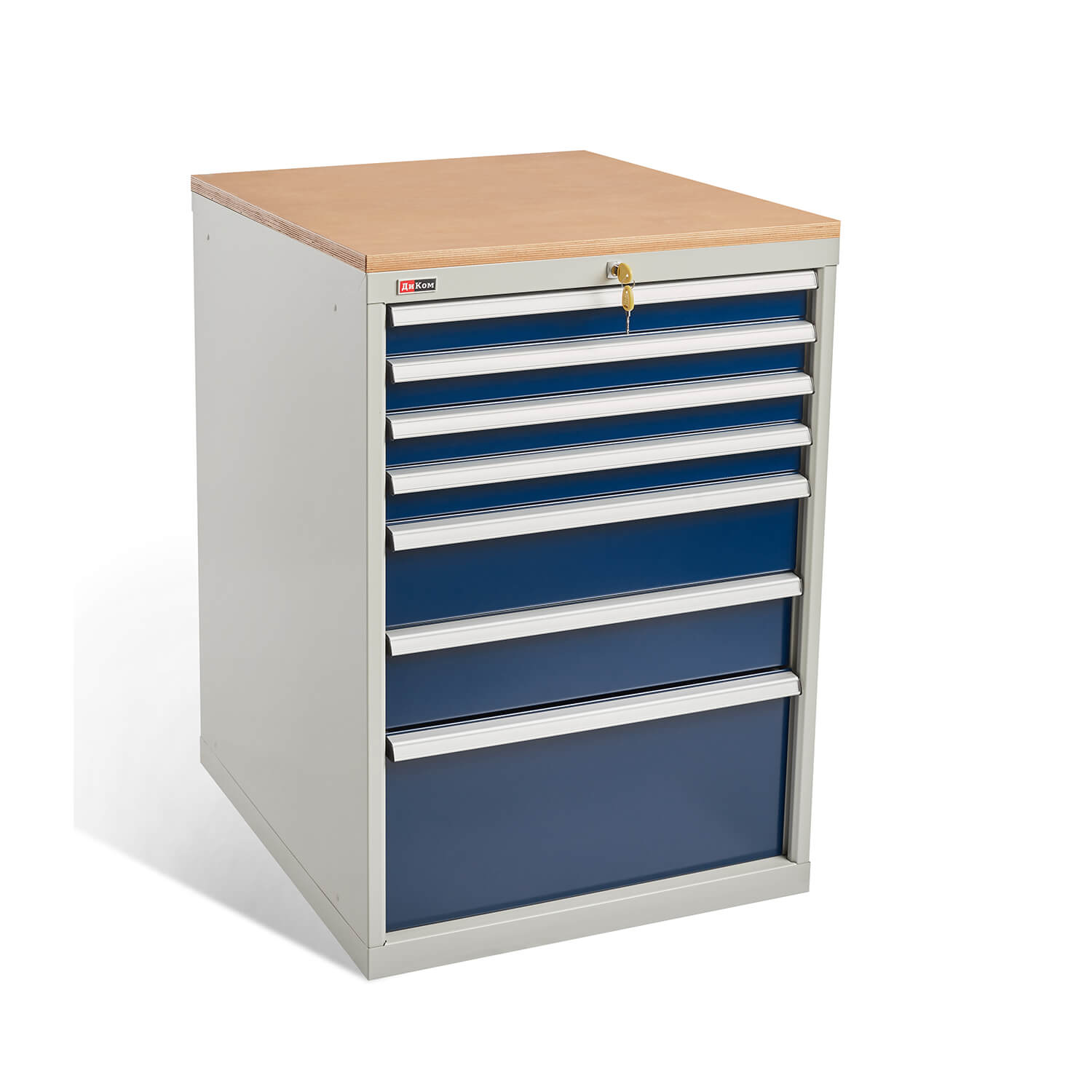 Семь выдвижных ящика тумбы высотой 75 мм, 150 мм, 300 мм оснащены общим центральным замком EURO-LOCKS (Германия, 2000 комбинаций). Внутренняя высота ящика меньше на 20 мм.