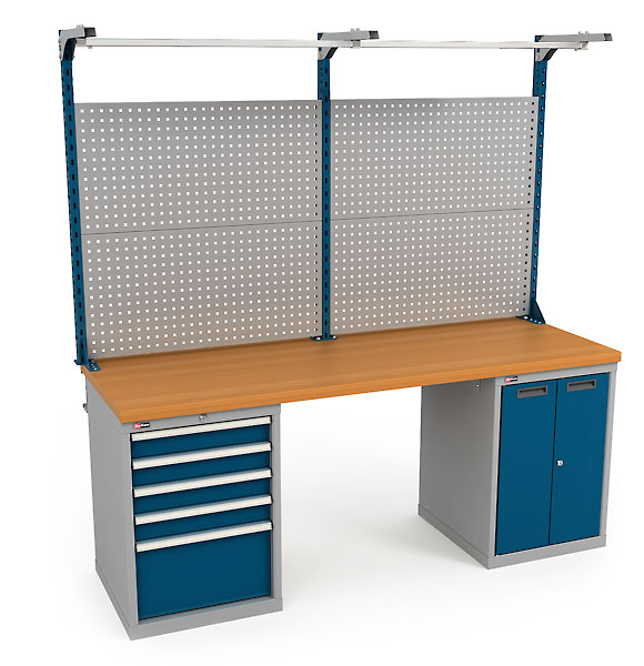 На верстак установлен Экран перфорированный (Э4). В нижнюю часть экрана по желанию устанавливается короб для коммуникаций. На экран с помощью зацепов легко устанавливаются полки и другие аксессуары. Максимальная нагрузка на Экран — 100 кг.