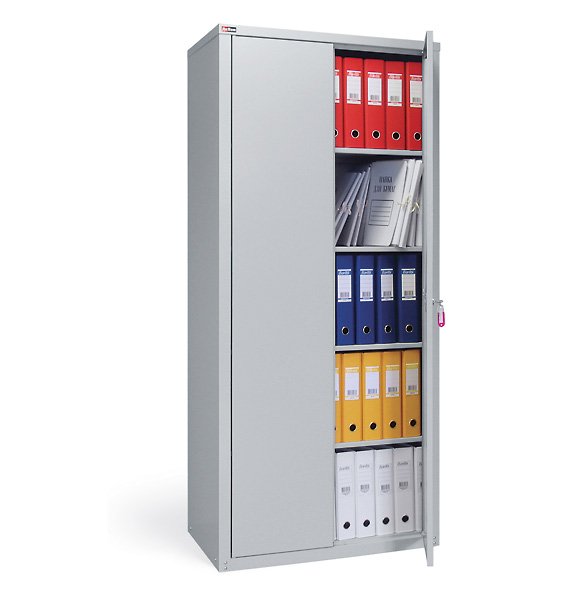 Шкаф укомплектован 4 съёмными полками. На полку можно поставить 2 ряда папок типа «ДЕЛО». Полки регулируются по высоте с шагом 50 мм. Допустимая нагрузка на полку 50 кг.