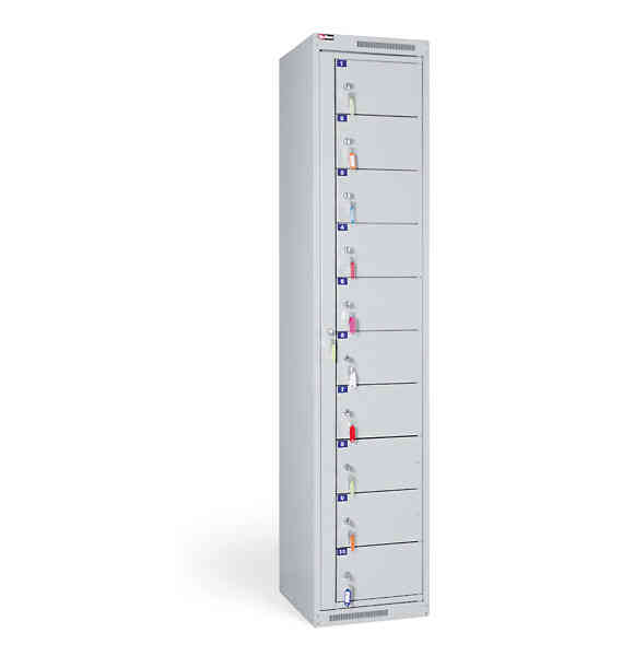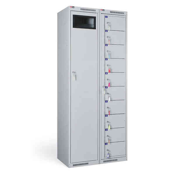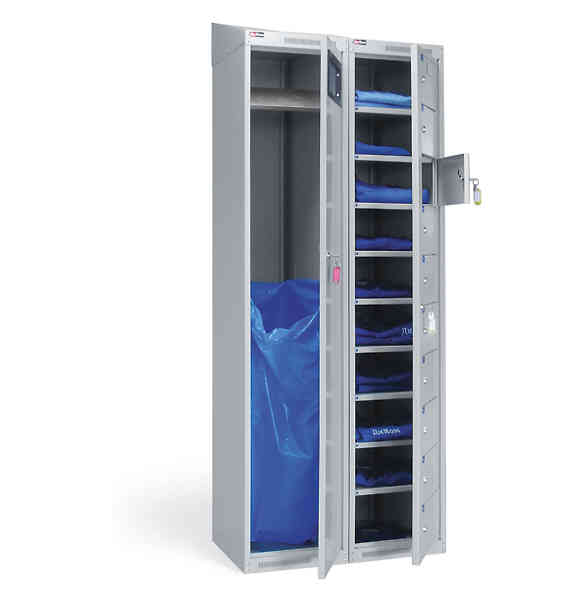 Шкаф АС-1010 имеет 10 ячеек. Для раскладки чистой спецодежды открывается общая дверь, для получения — каждая ячейка открывается своим ключом. Ячейки пронумерованы.