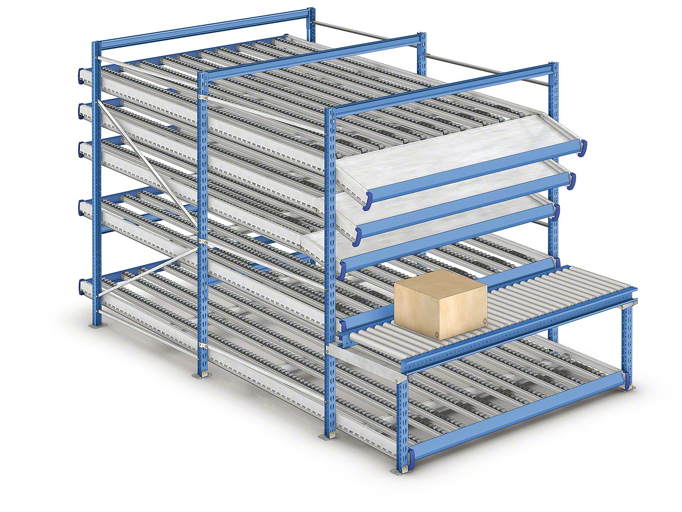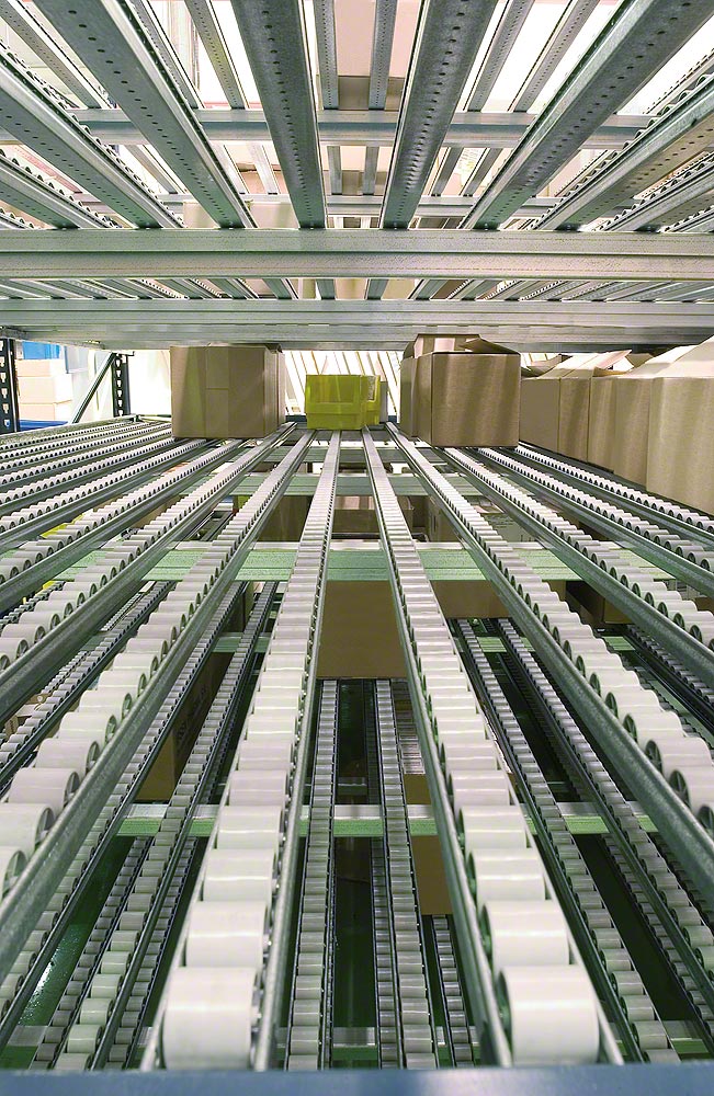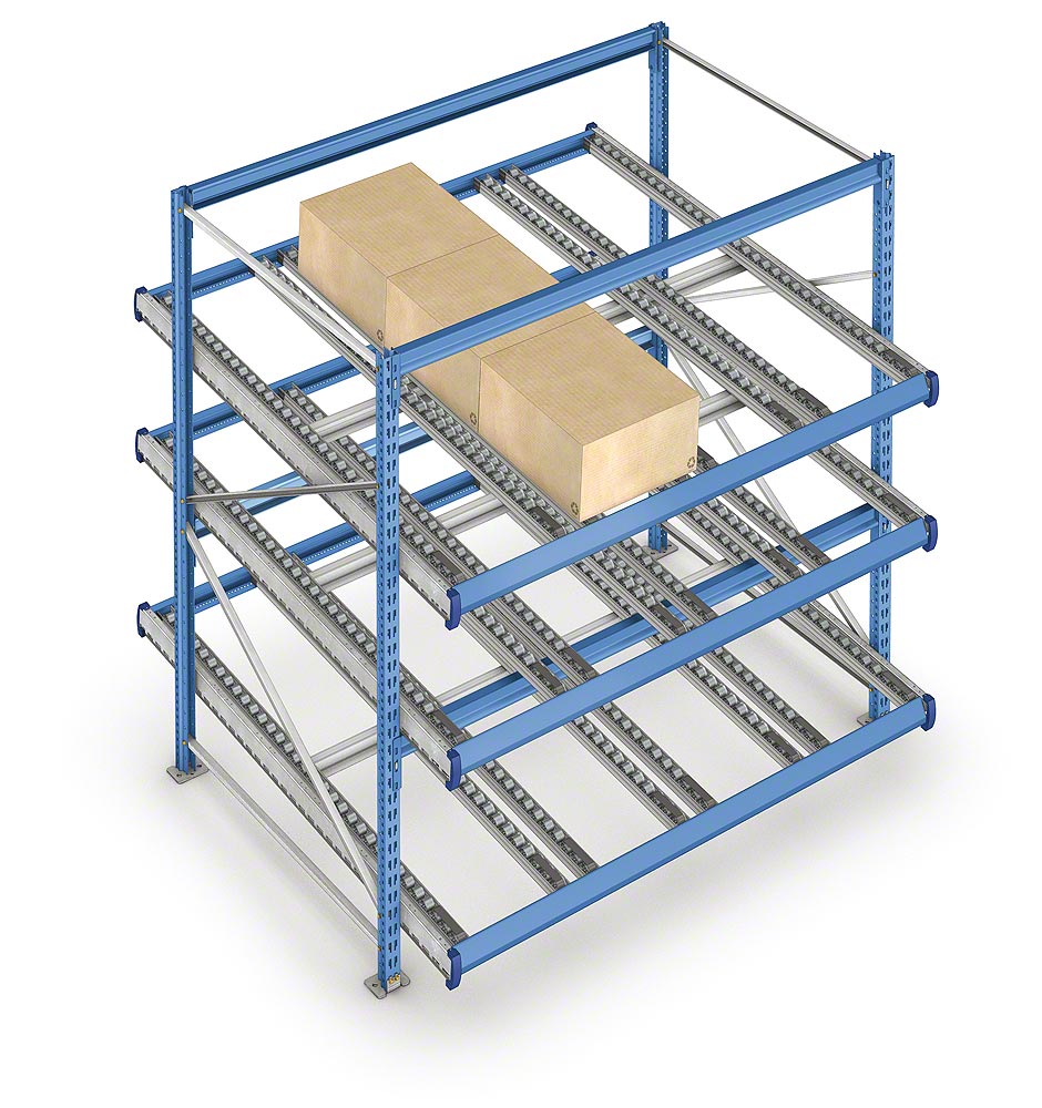 Стеллажи состоят из наклонных платформ с рольгангами или роликовыми дорожками, которые гарантируют оптимальную загрузку и выгрузку материала. Товар поступает с одного конца и под действием силы тяжести двигается к противоположной стороне канала, откуда производится его выгрузка. Таким образом обеспечивается отличная ротация продукта, избегается взаимоналожение задач по восстановлению складских запасов и извлечению материала, и в то же время повышается скорость обработки заказов.