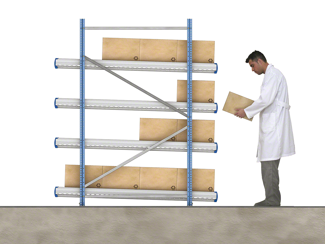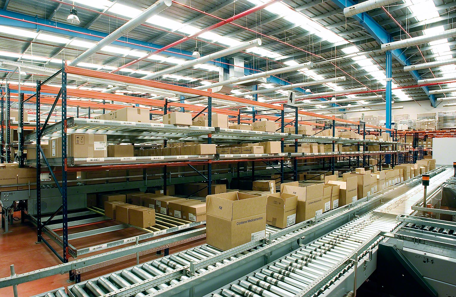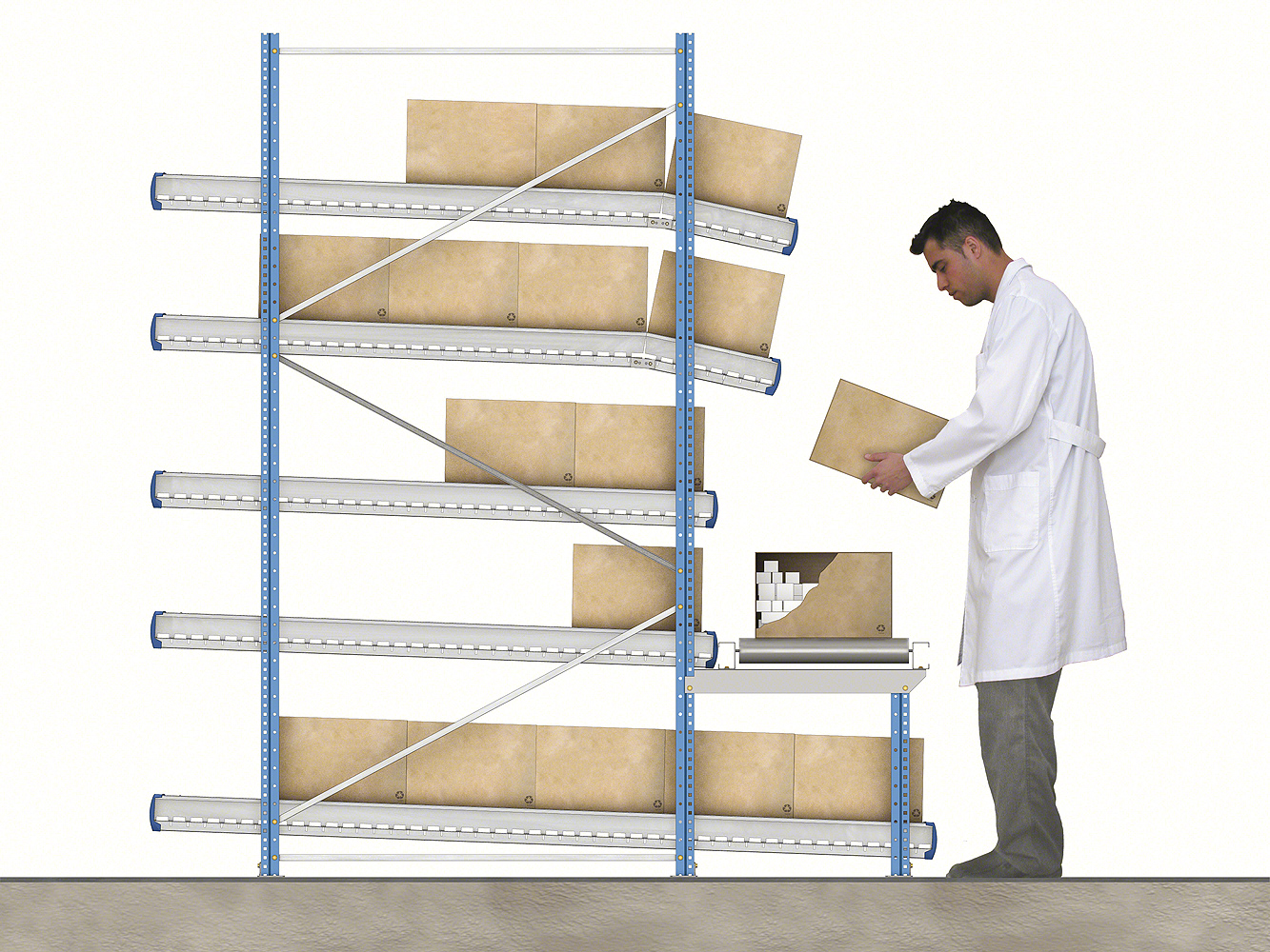 Стеллажи состоят из наклонных платформ с рольгангами или роликовыми дорожками, которые гарантируют оптимальную загрузку и выгрузку материала. Товар поступает с одного конца и под действием силы тяжести двигается к противоположной стороне канала, откуда производится его выгрузка. Таким образом обеспечивается отличная ротация продукта, избегается взаимоналожение задач по восстановлению складских запасов и извлечению материала, и в то же время повышается скорость обработки заказов.