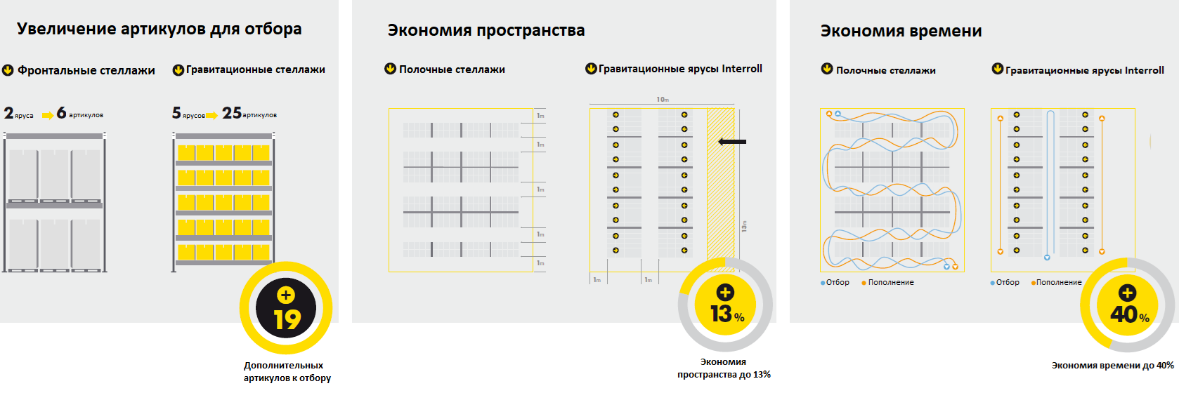 Система была создана для зон склада, где происходит большой объем работы по комплектации заказов. Она увеличивает число линий комплектации и позволяет избежать перемещений персонала, производящего эти операции.