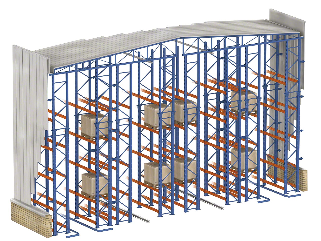 Складирование товаров на большую высоту с максимальным использованием доступной площади. Стеллажи – часть конструкции здания.